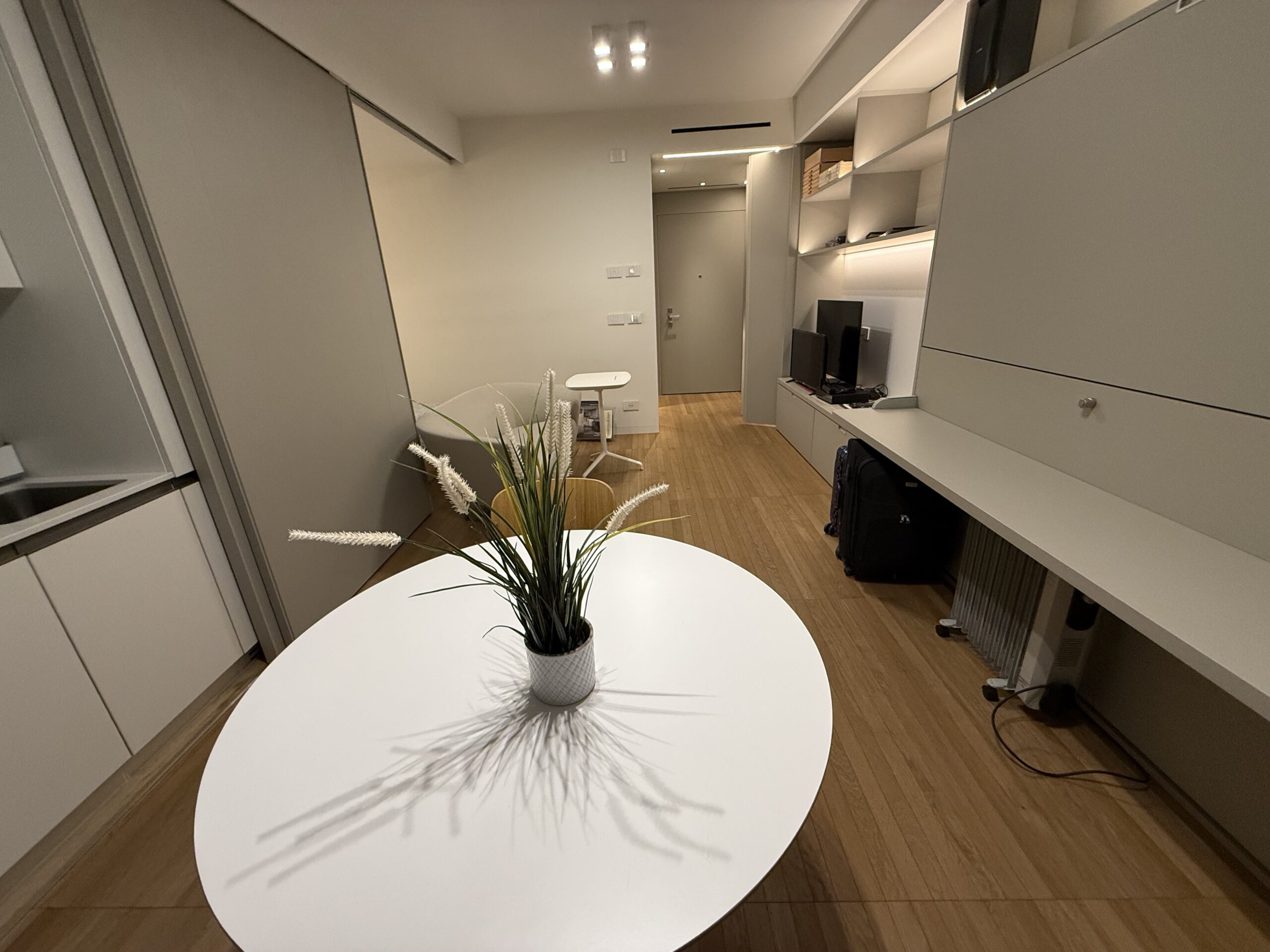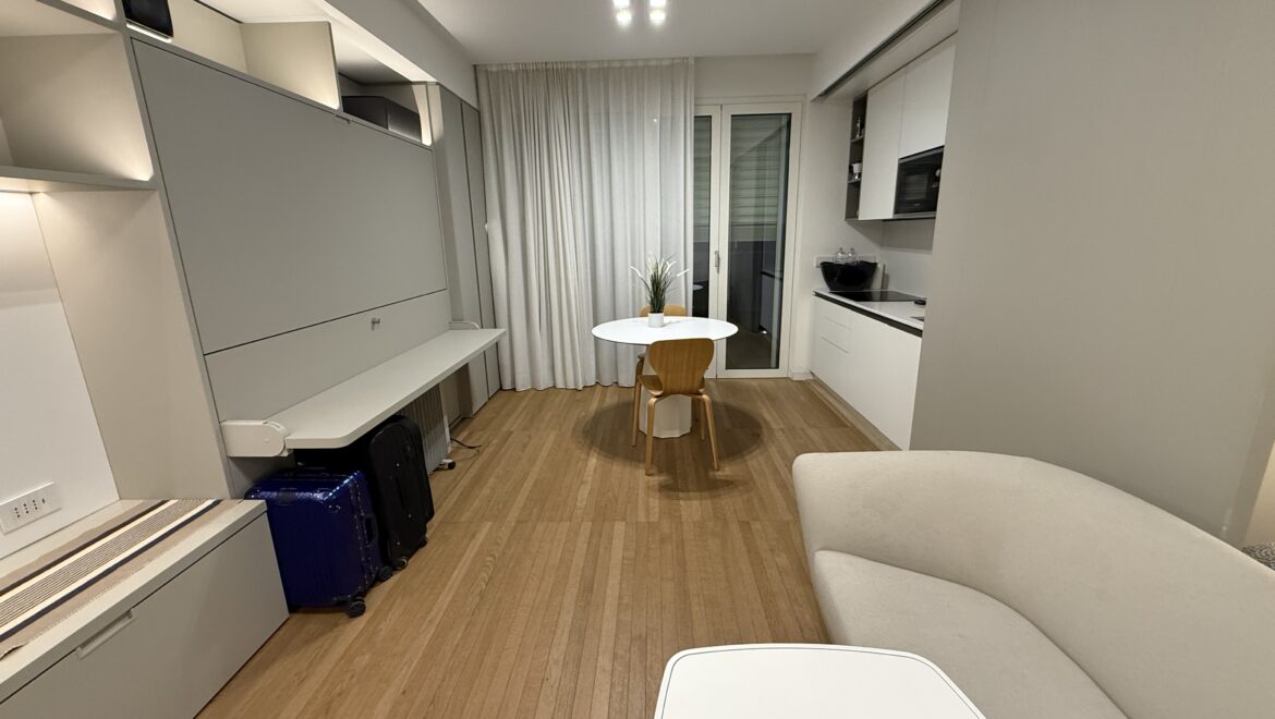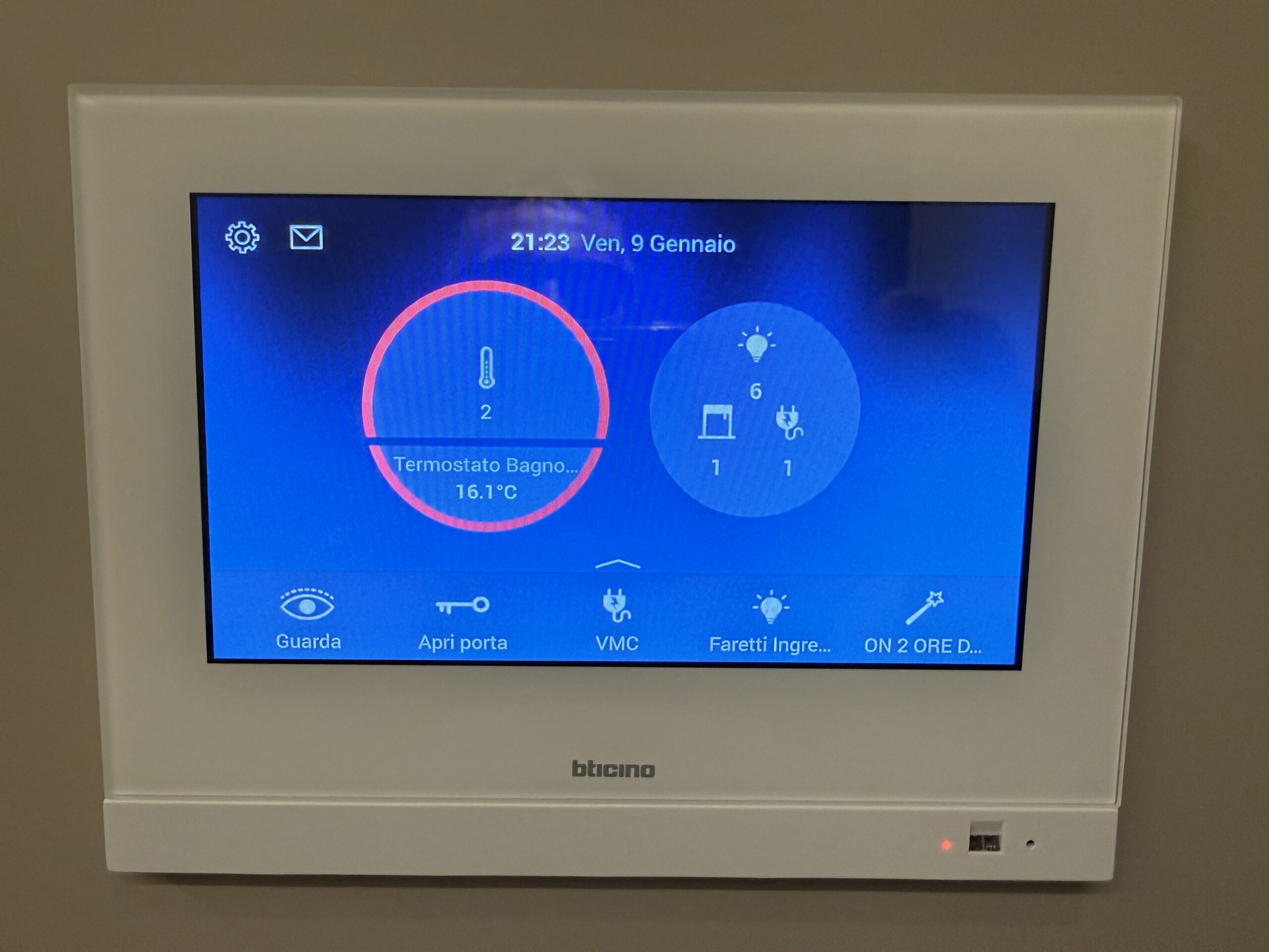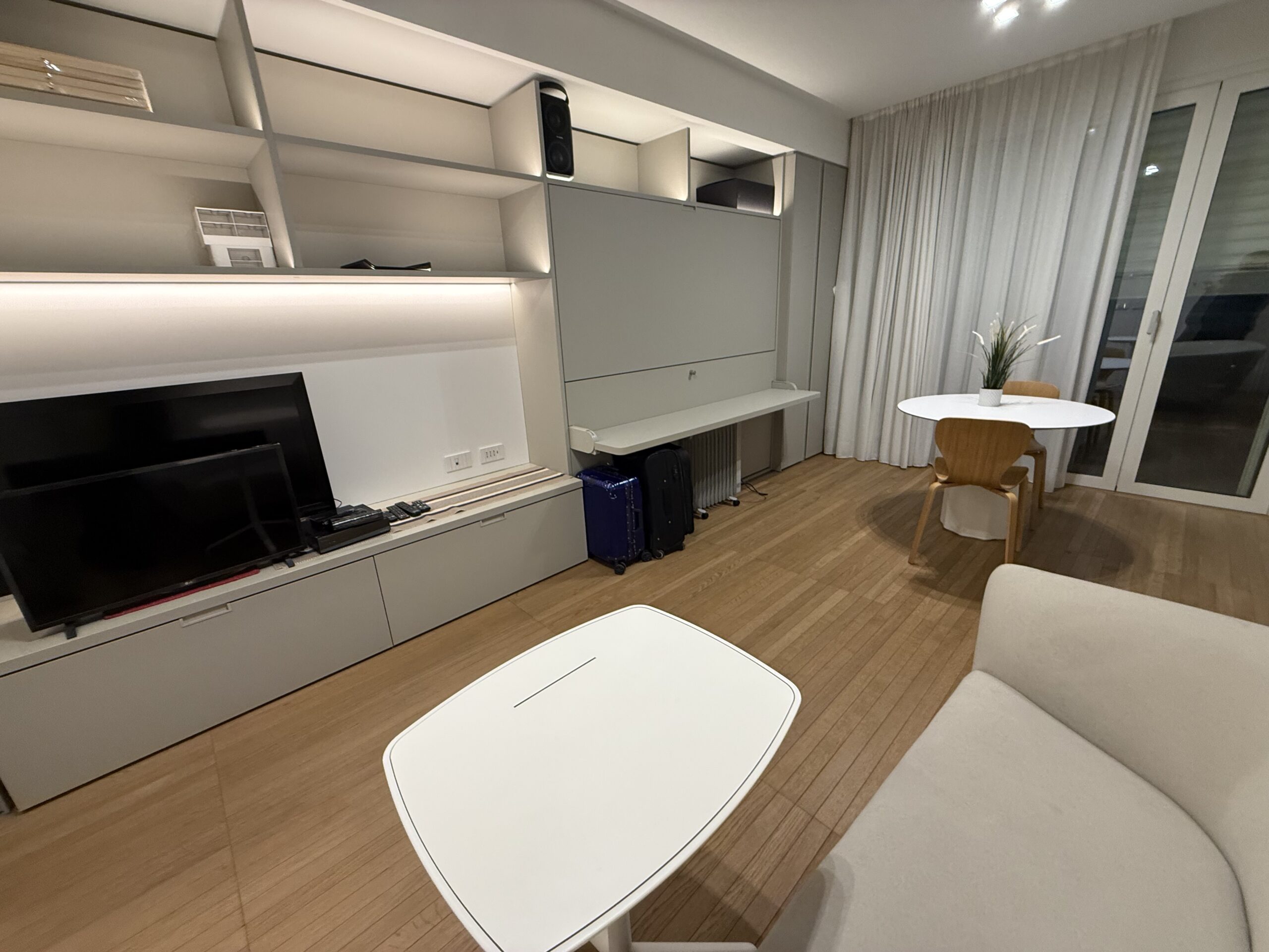 Il soggiorno si affaccia su un comodo terrazzino, ideale per godere di momenti di relax all’aperto. L’appartamento è dotato di un avanzato sistema domotico MyHOME_Up di BTicino.